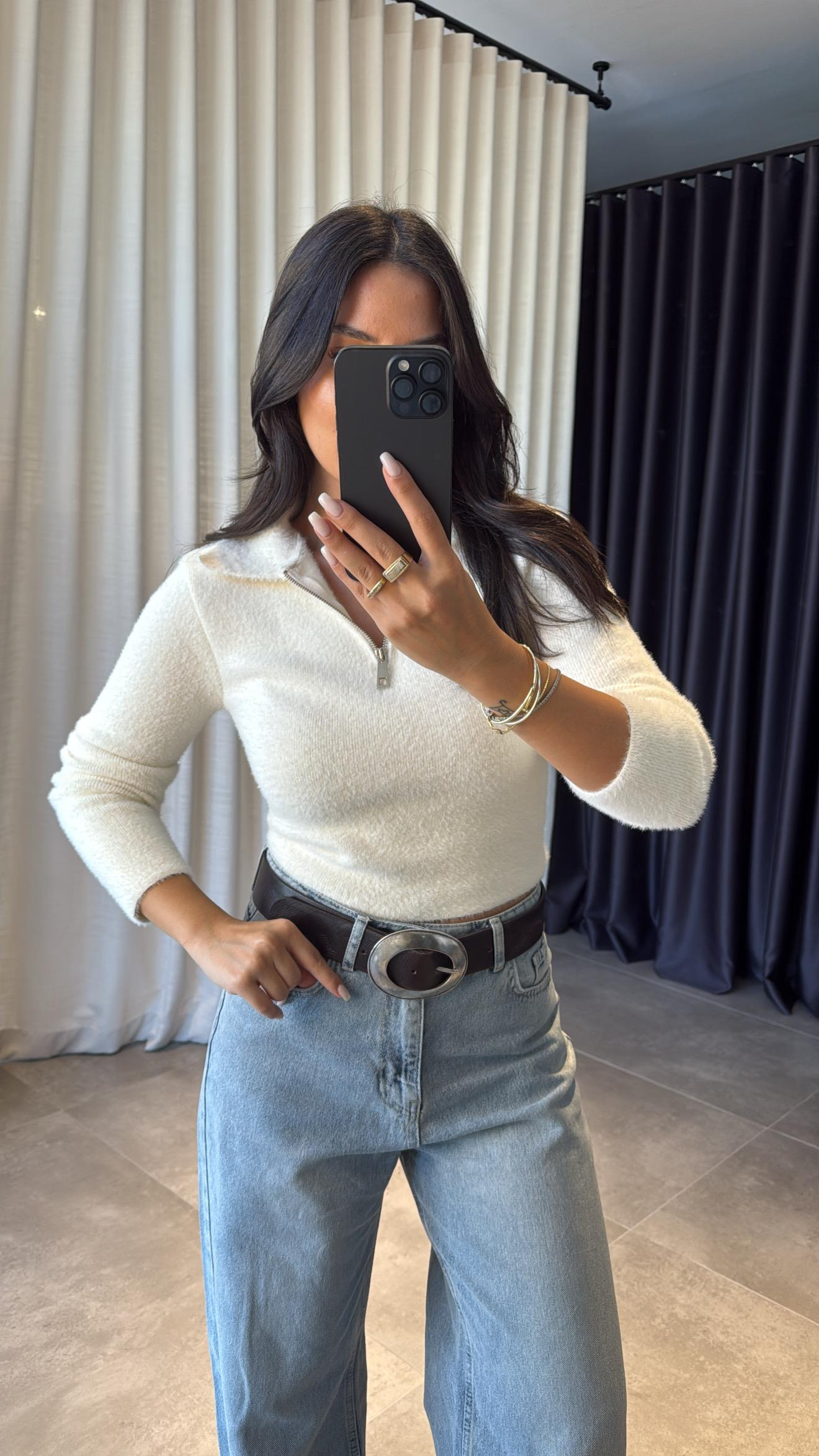 Krem Yumuş Fermuarlı Kazak